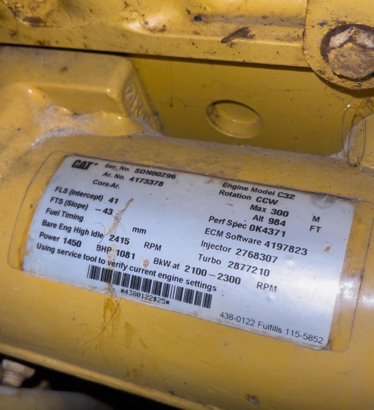 2 pcs Caterpillar C32DITTA ACERT Marine propulsion engines Each rated at 1450Hp (1081Kw) @ 2100~2300RPM S/n SDN00296 S/n SDN00324 Arr# 4173378 Perf spec OK4371 2013 year built with only 32 total hours since new Excellent running take outs Heat exchanger cooled C/w Twin Disc MGX6599 Marine gearboxes Electronic shift Ratio: (ratio is not yet clarified)